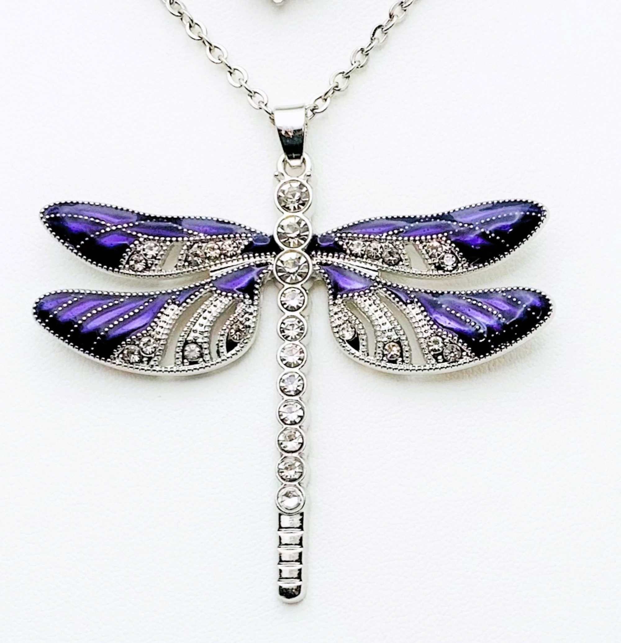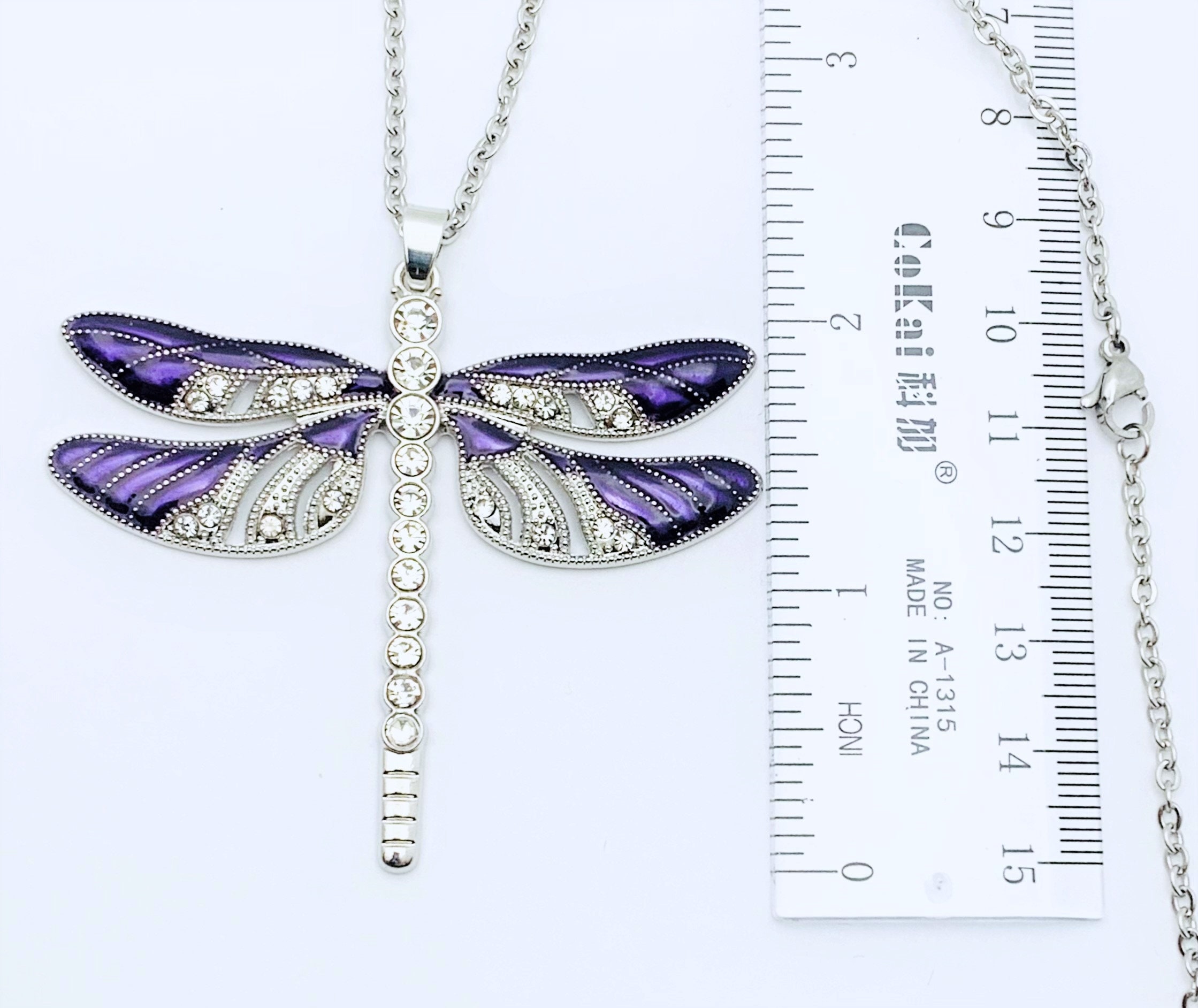 Dragonfly Platinum and Indigo Pendant Necklace. Platinum plated alloy with enamel and rhinestones dragonfly on a 24" tarnish resistant stainless-steel chain. Pendant is 64 mm wide and 57 mm long. (2.51 inch wide and 2.24 inch long) 20393