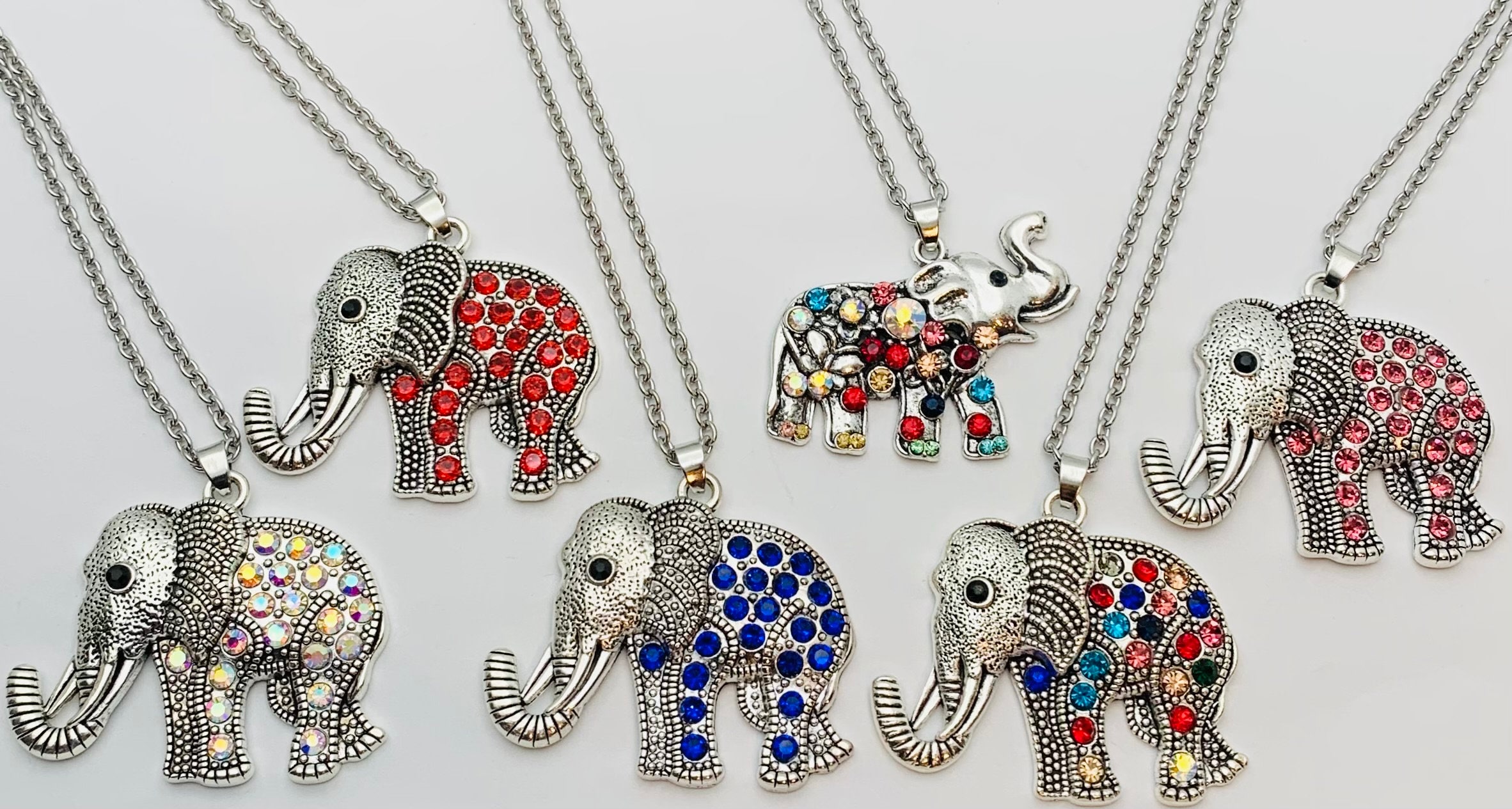 Tibetan Style Alloy Rhinestone Elephant Pendant Necklace. Cadmium Free & Lead Free on a 24" tarnish resistant stainless-steel cable chain. Pendant size is 43mm/1.69"x51mm/2.00". 20442