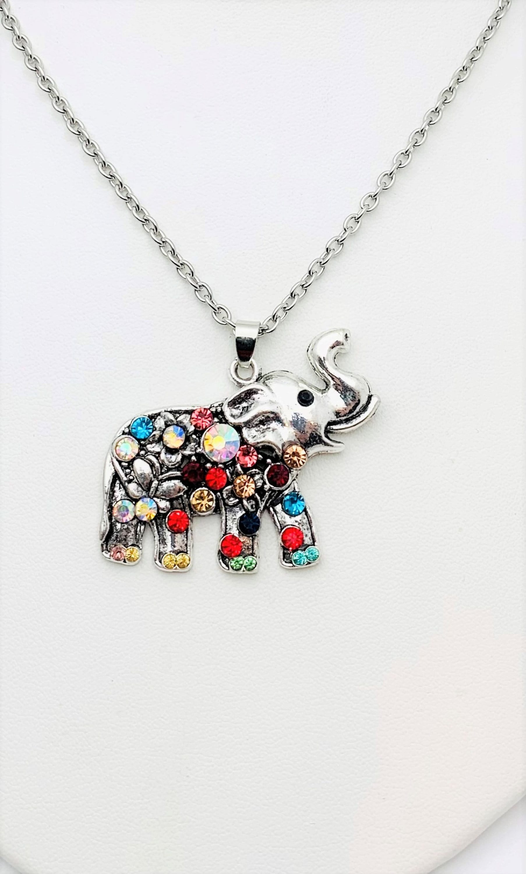 Elephant Pendant Necklace Multi Color Rhinestone. Silver alloy rhinestone pendant on a 24" tarnish resistant 304 Stainless-steel cable chain. The stones in this multi-colored elephant are random in each elephant. Pendant size is 35mm/1.37"Long X 45mm/1.77"Wide 20442