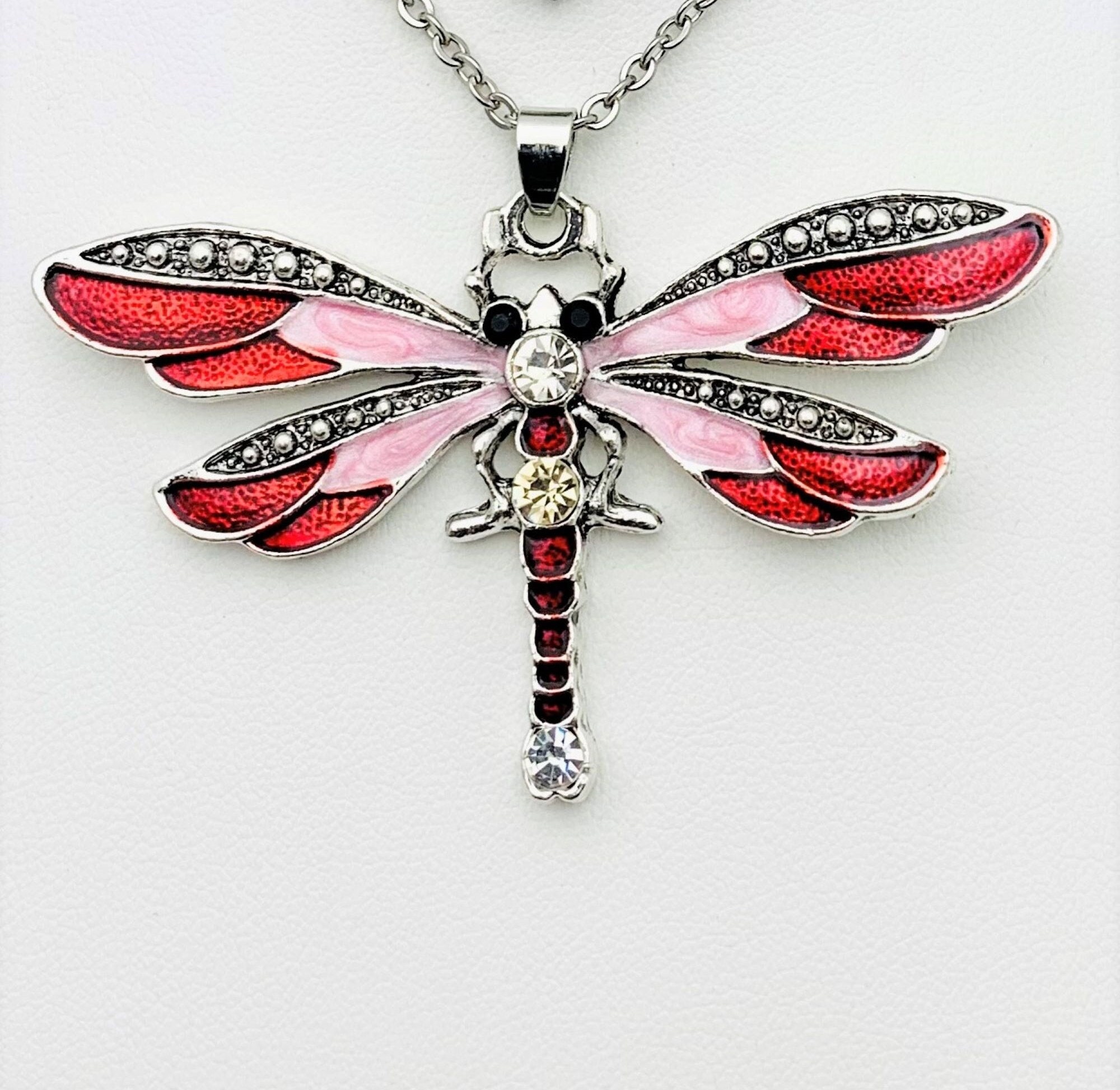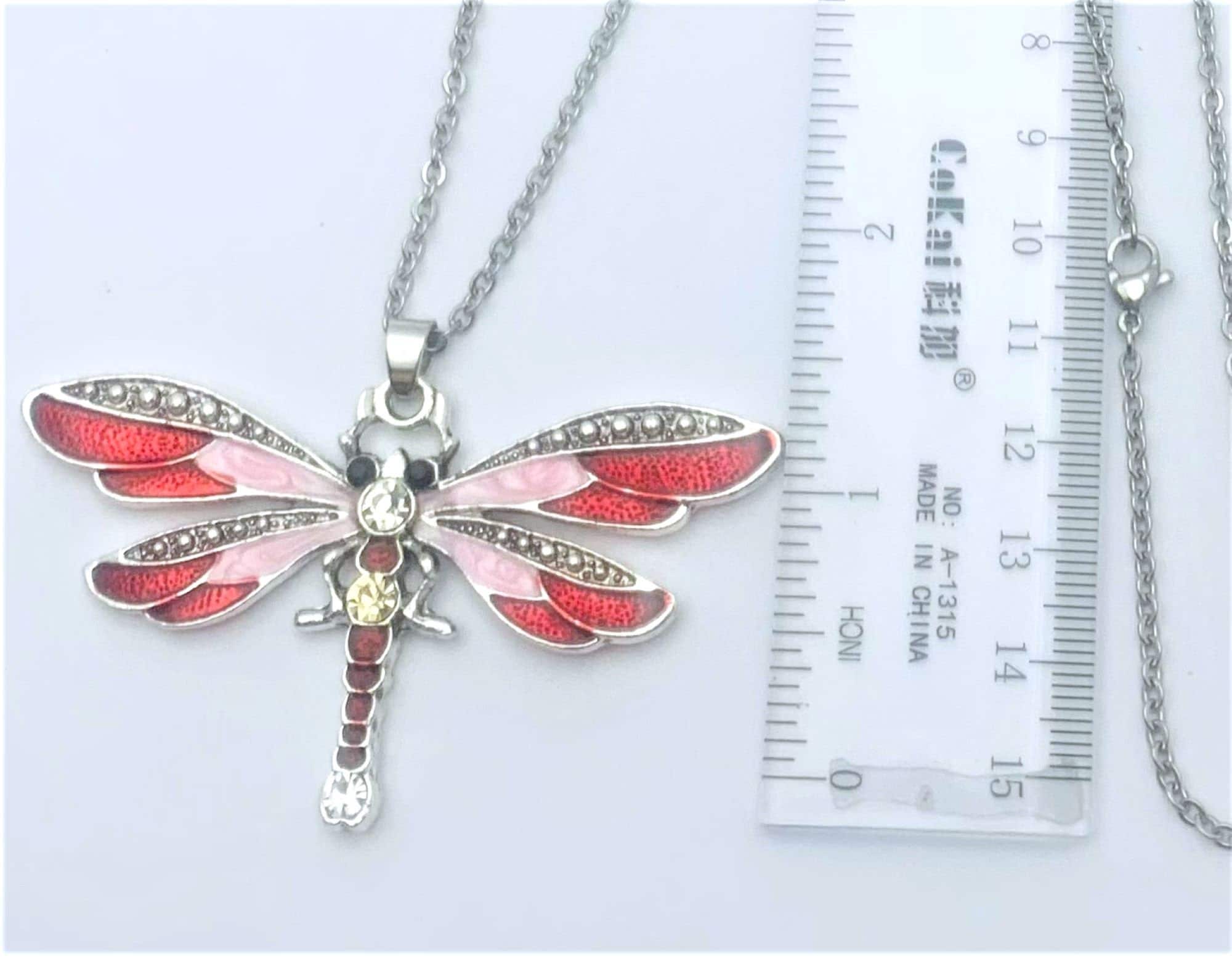 Dragonfly Silver and Pink/Red Pendant Necklace. Antique silver-plated alloy with enamel and rhinestones dragonfly on a 24" tarnish resistant stainless-steel chain. Pendant is 72 mm wide and 42 mm long. (2.83 inch wide and 1.65 inch long)20393