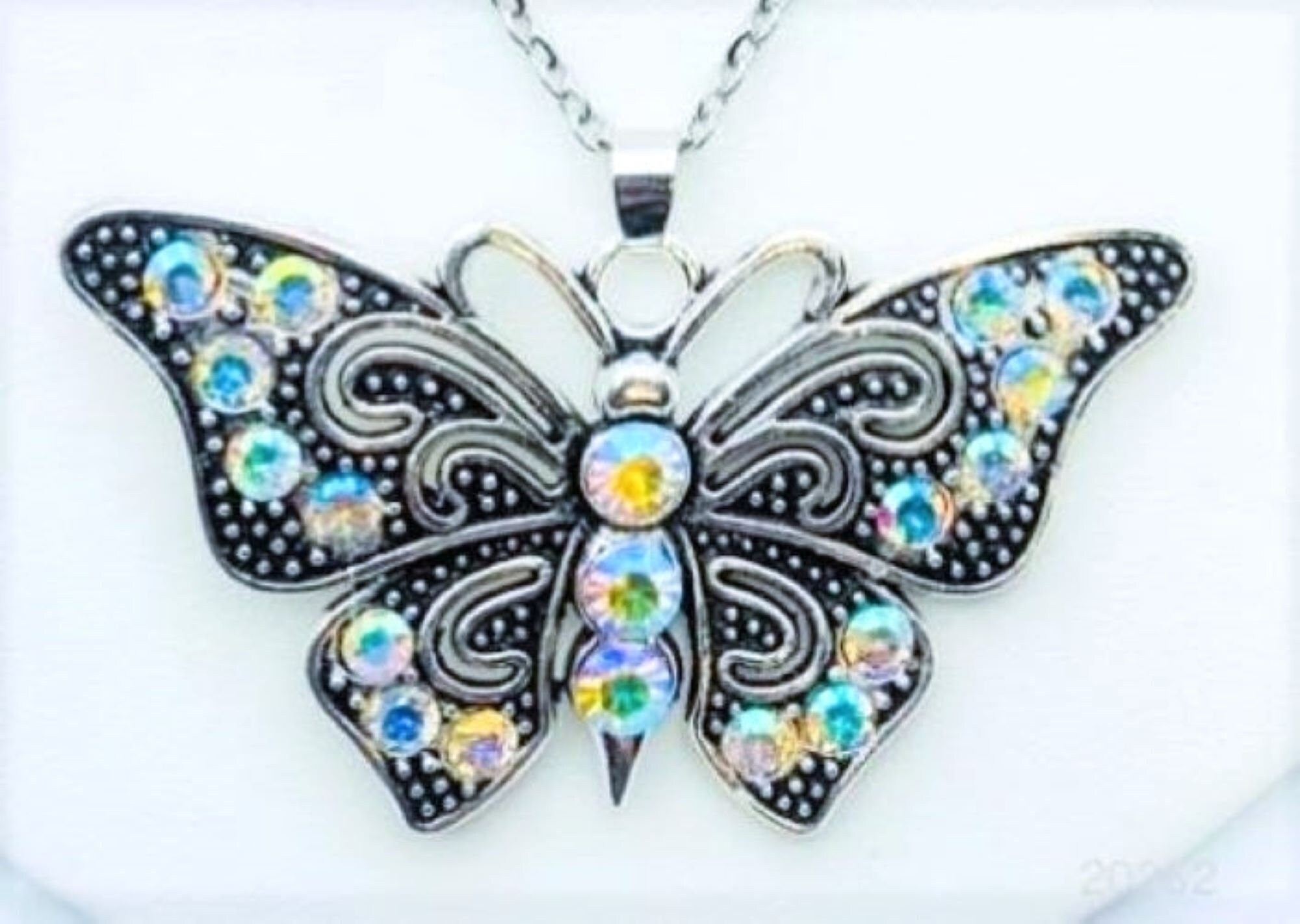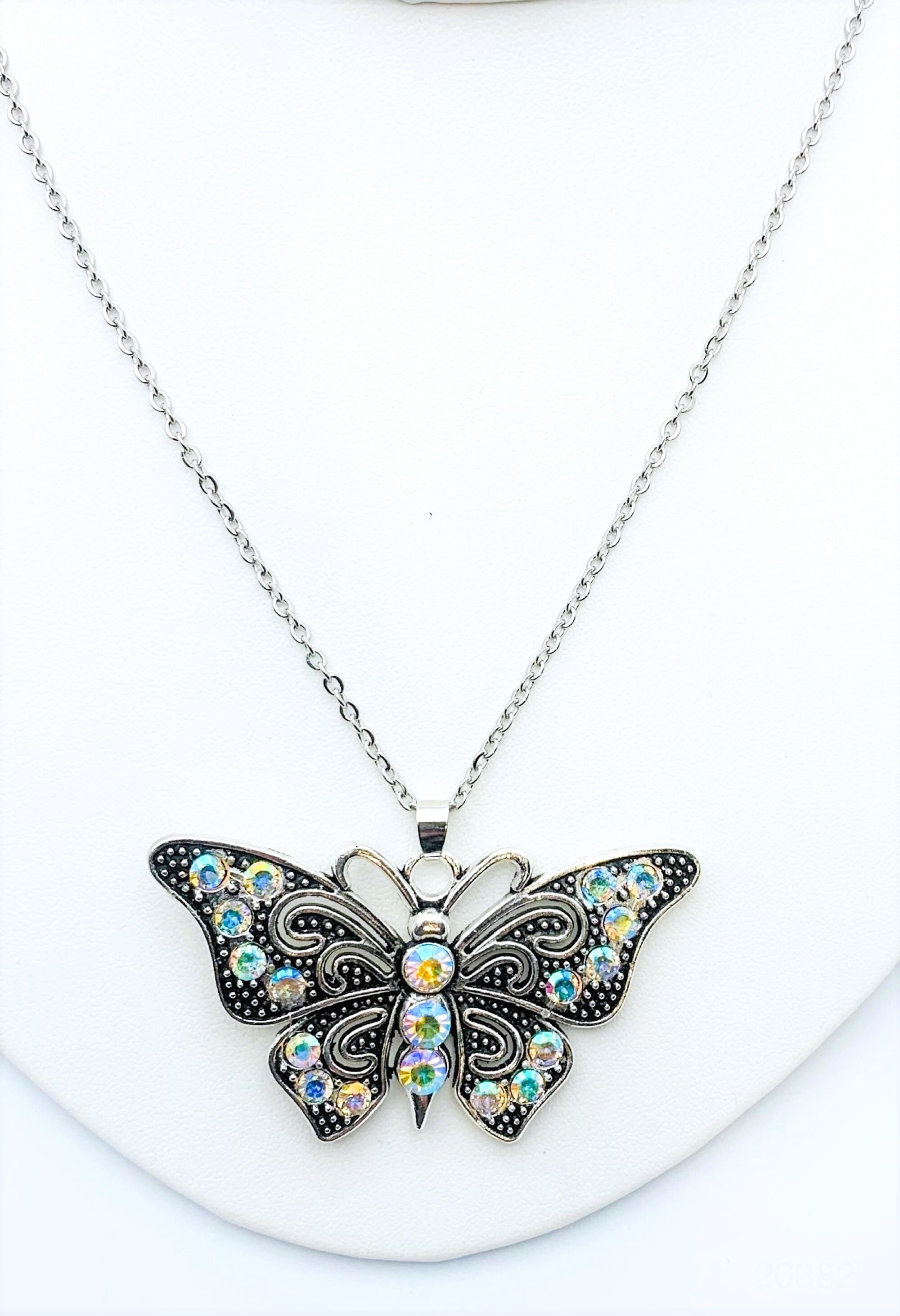 Vintage Style Butterfly Pendant Necklace. Antique silver color alloy butterfly pendant with crystal color rhinestones on a 24" stainless steel tarnish resistant cable chain. Butterfly pendant is 67mm wide and 37mm long.(reference 25 mm equals 1 inch)