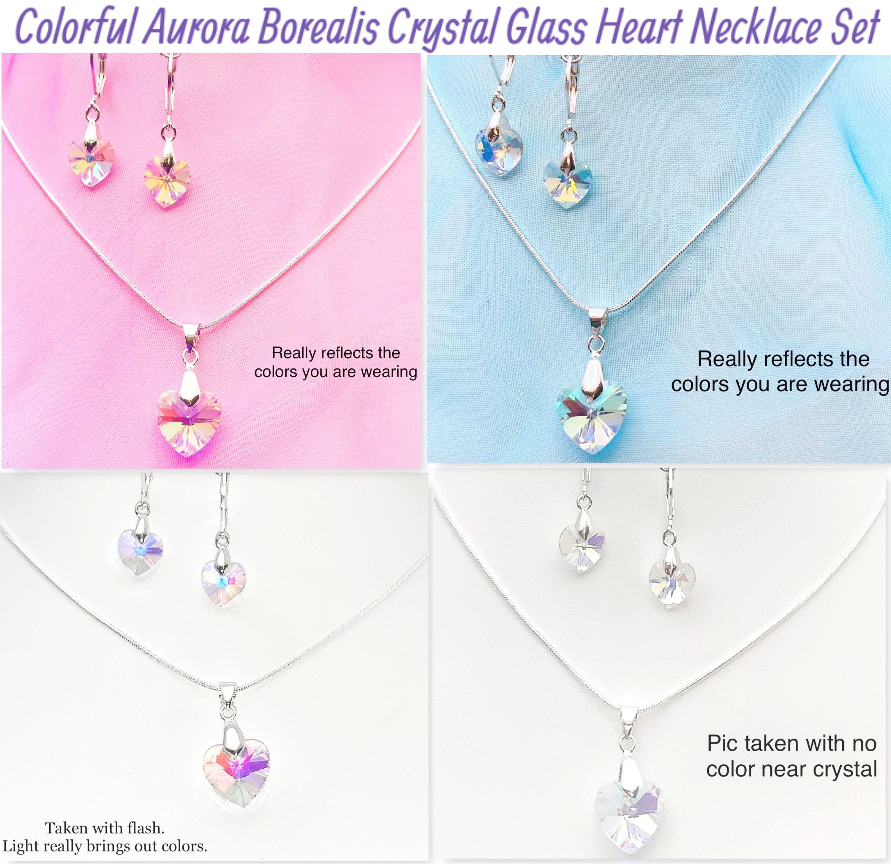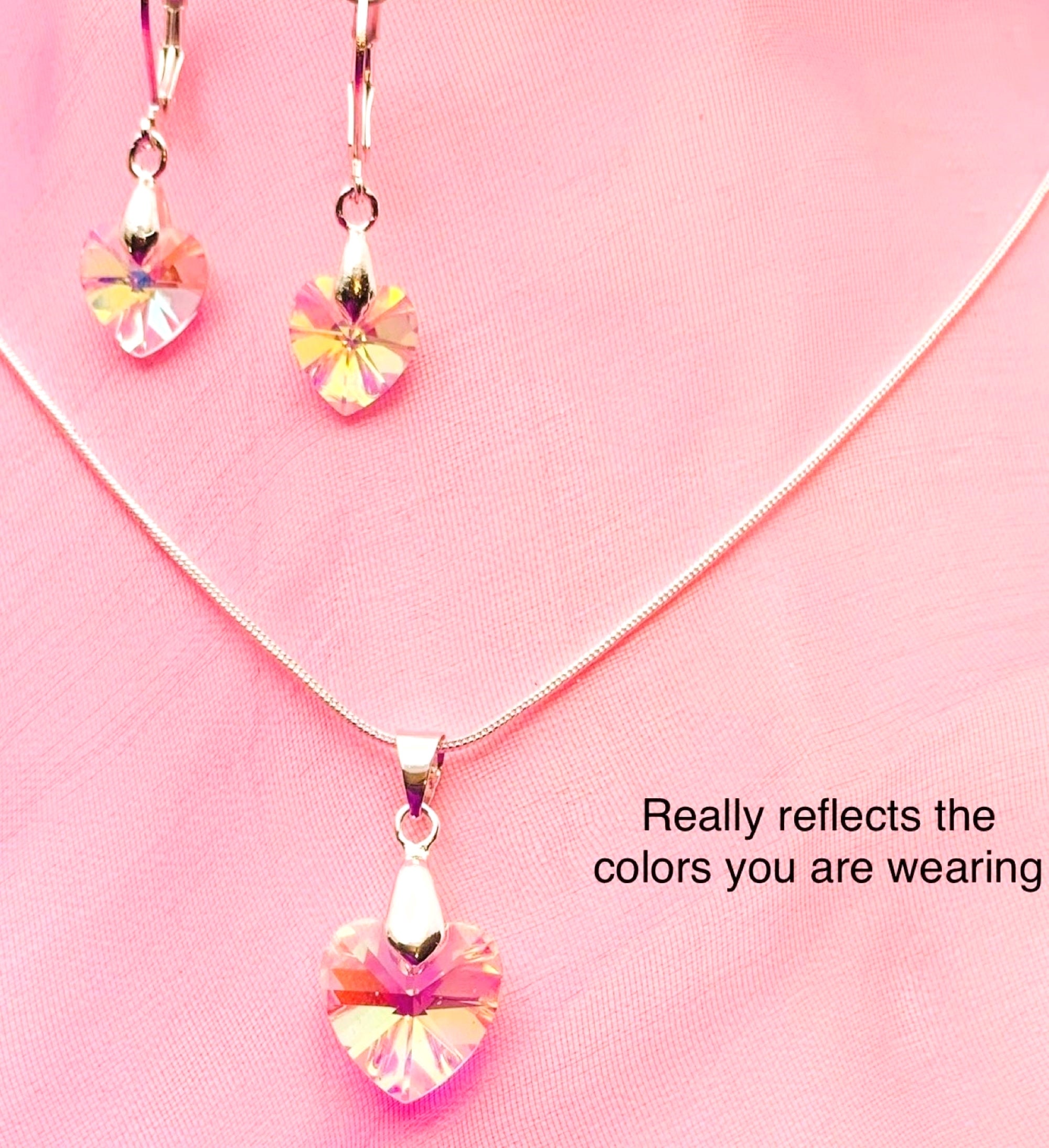 Clear to Colorful Aurora Borealis Crystal Glass Heart Necklace Set on a 20" 925 silver plated snake chain. Necklace heart is 14 mm and hangs approx. 26 mm with bail. Earring hearts are 10 mm and hang approx. 15 mm. Earrings are 925 silver plated fish hook ear wire. Bail is silver plated brass. (for reference 25 mm equals 1 inch) 14/102ArrBrls