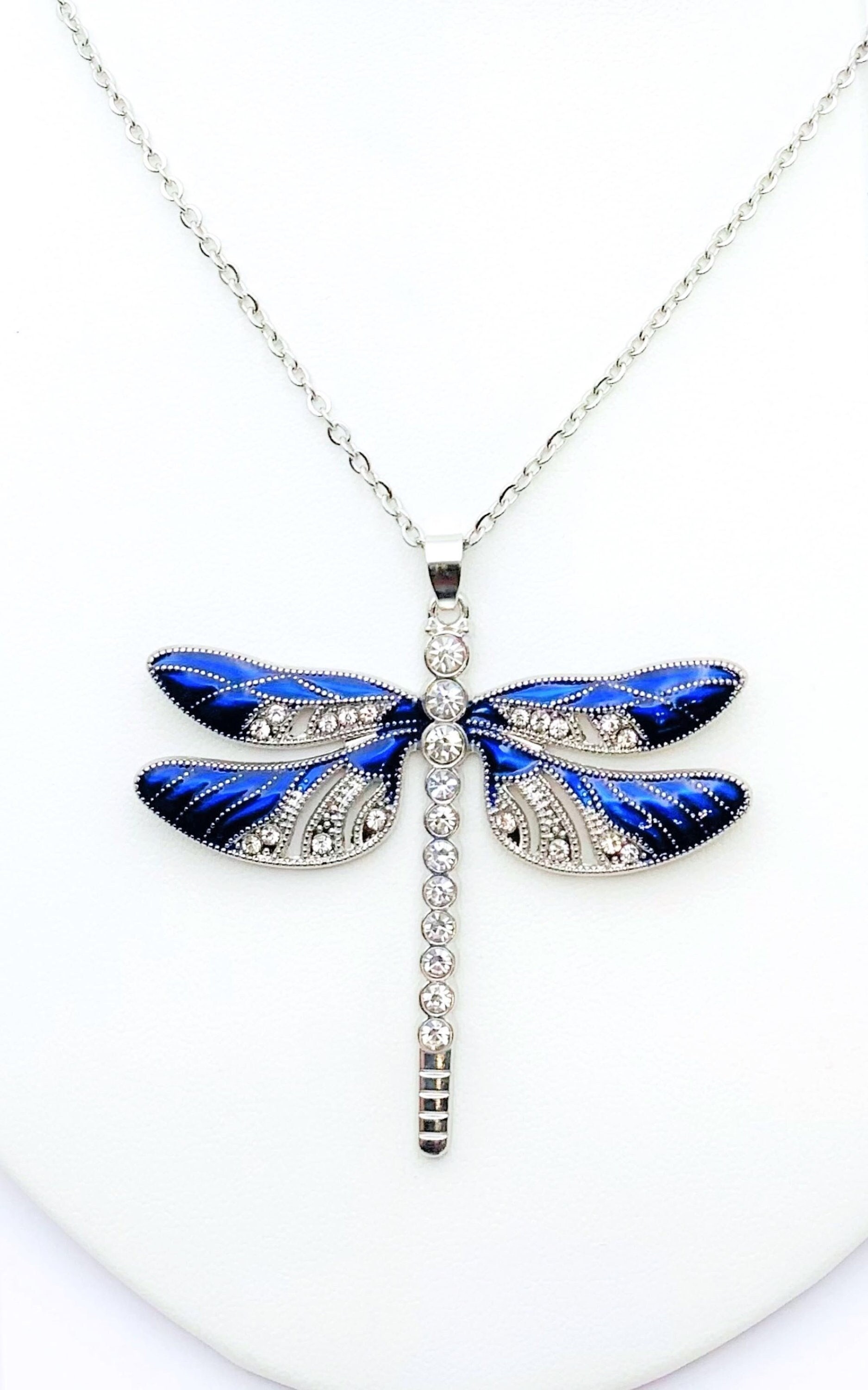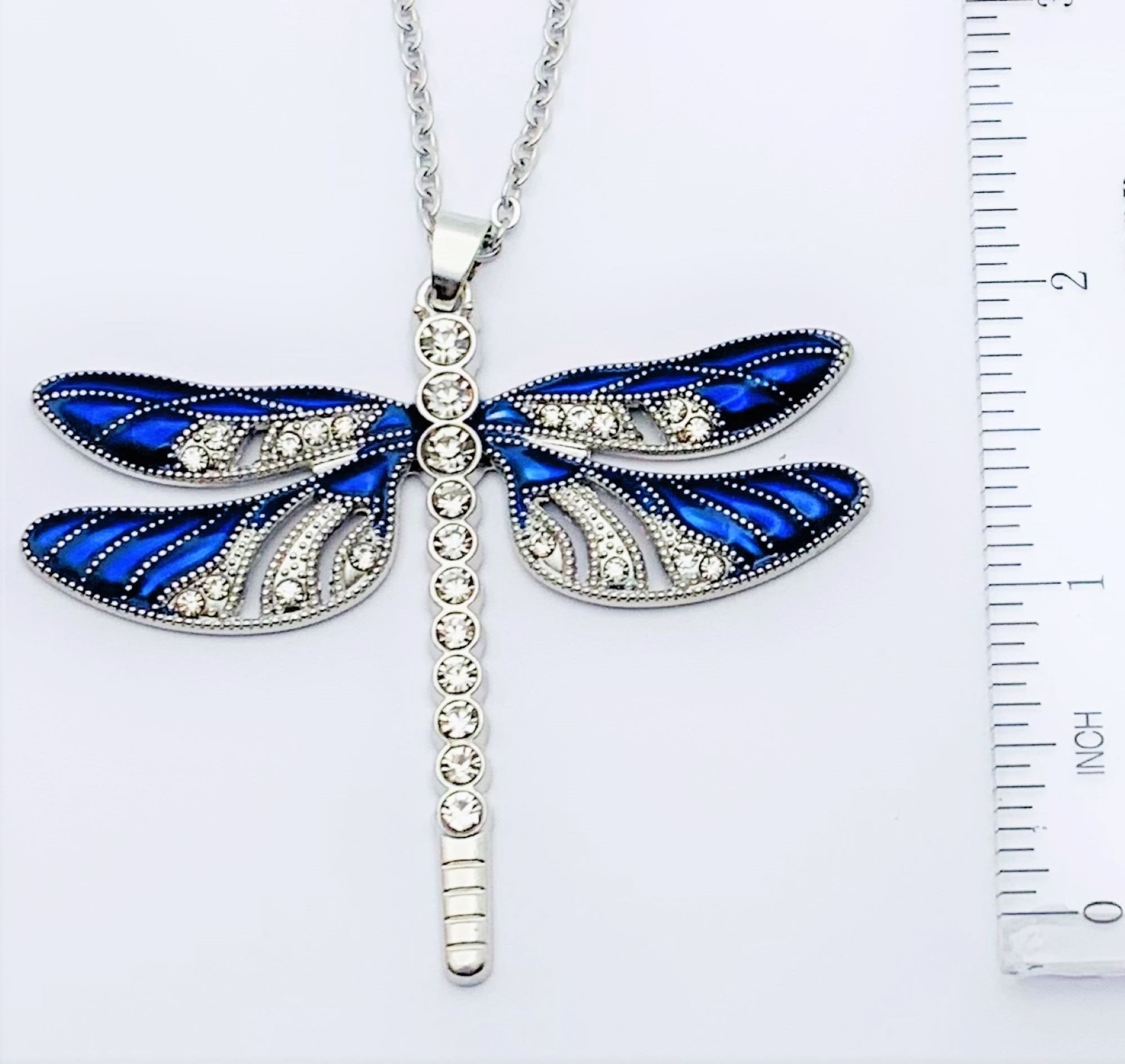 Dragonfly Platinum and Royal Blue Pendant Necklace (Pendant 2.51 inch wide and 2.24 inch long). Platinum plated alloy with enamel and rhinestones dragonfly on a 24" tarnish resistant stainless steel chain. Pendant is 64 mm wide and 57 mm long. (2.51 inch wide and 2.24 inch long) 2512242RylBlueDF