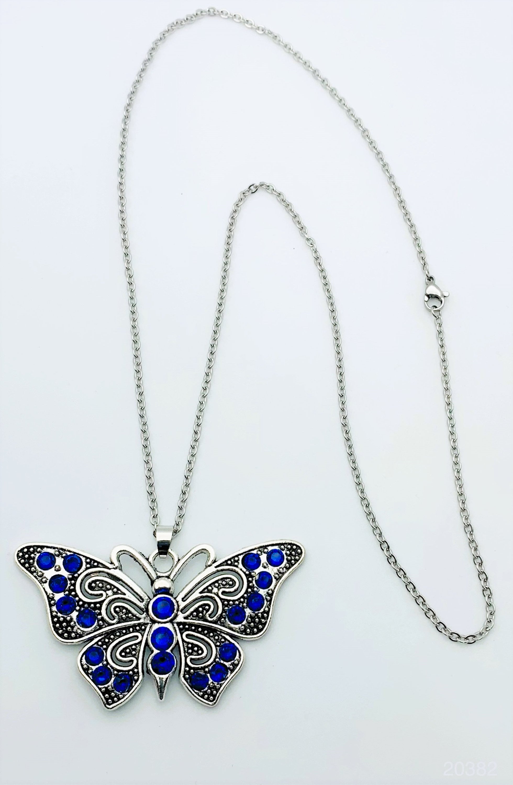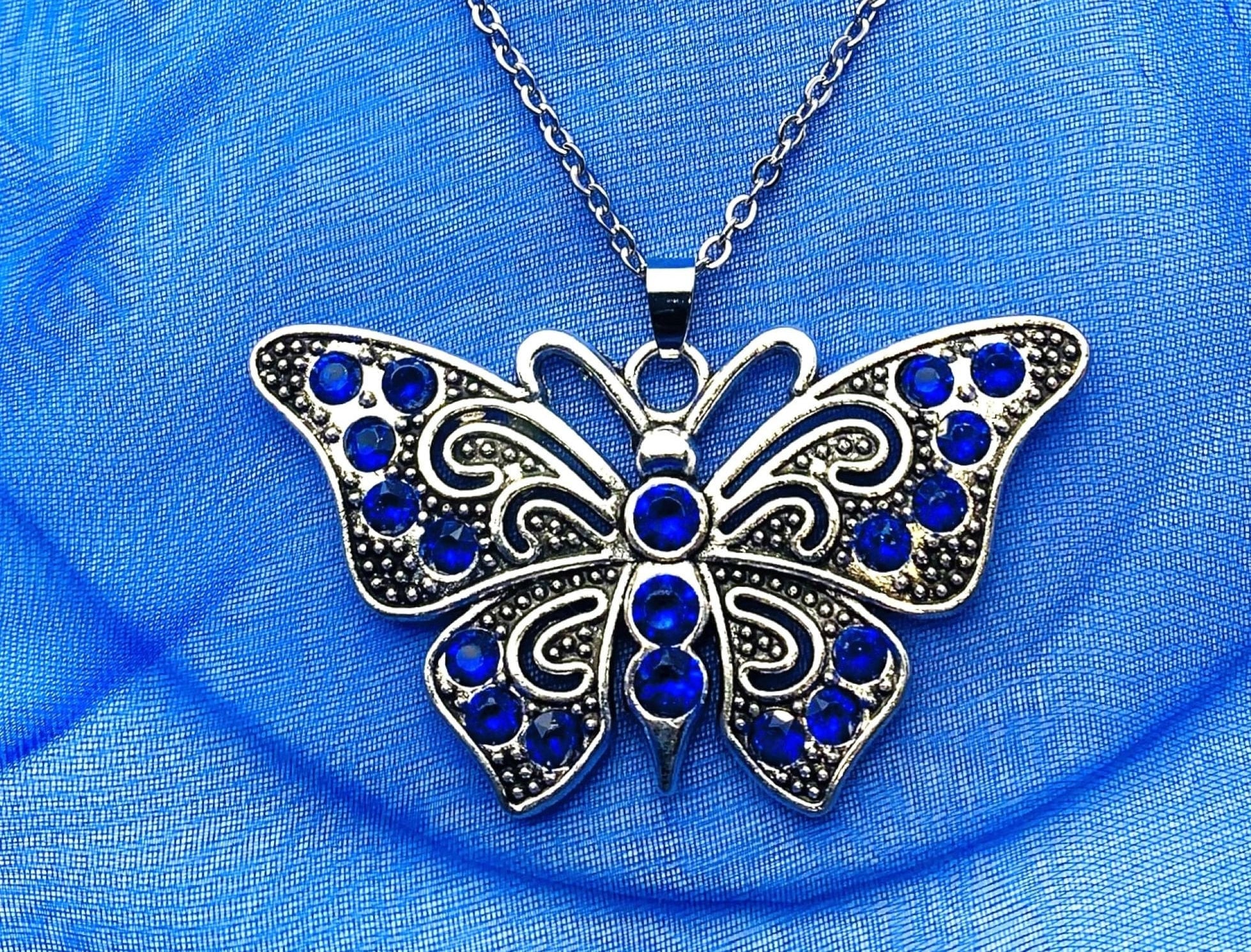 Vintage Style Butterfly Pendant Necklace. Antique silver color alloy butterfly pendant with sapphire color rhinestones on a 24" stainless steel tarnish resistant cable chain. Butterfly pendant is 67mm wide and 37mm long.(reference 25 mm equals 1 inch) 1452632SphrBF