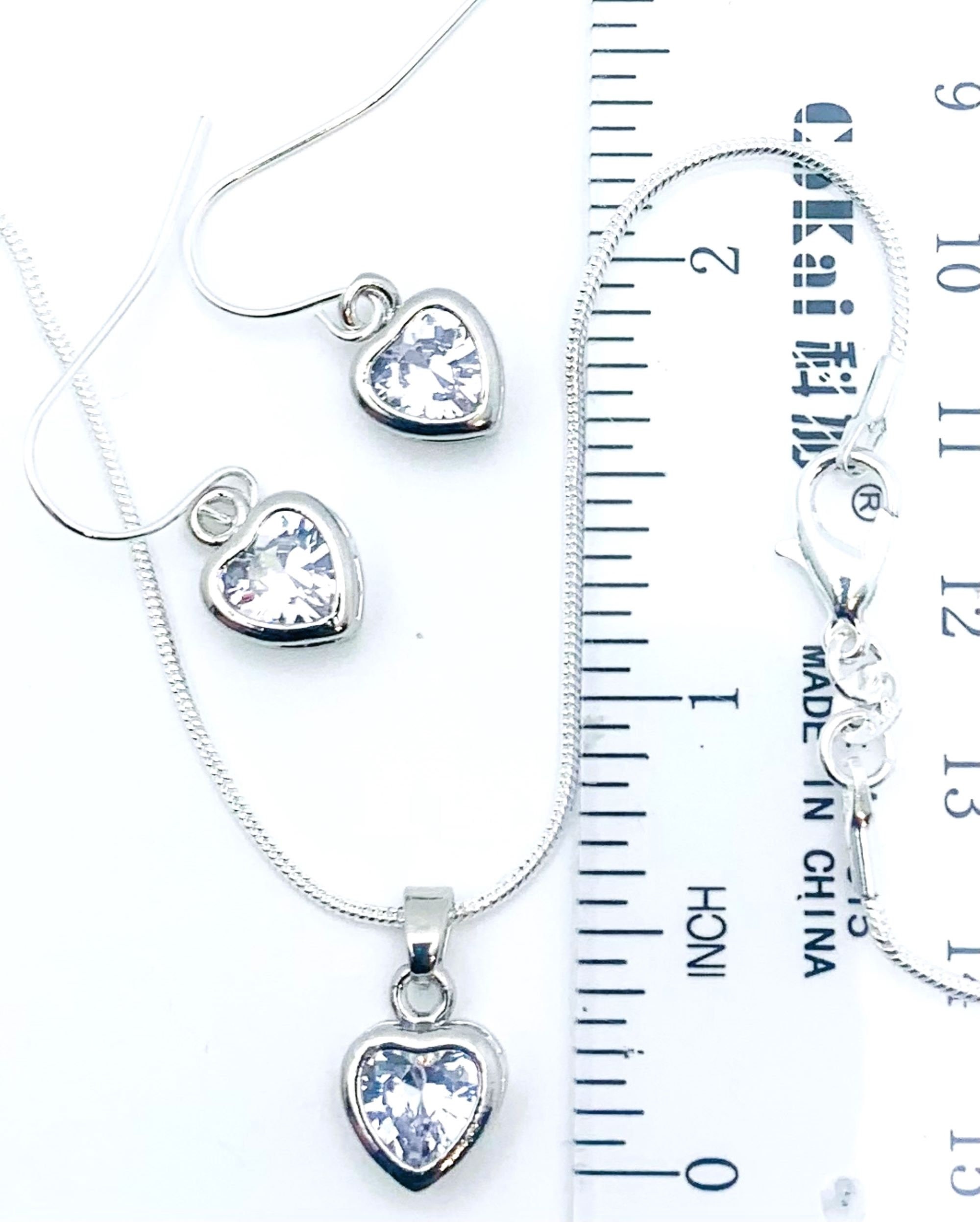 Platinum color brass Cubic Zirconia Heart Necklace/Earring Set on a 22" 925 silver plated snake chain with a lobster claw clasp. Heart 12mm/0.47"Long X 9mm/0.35"Wide 0470352CZHrt