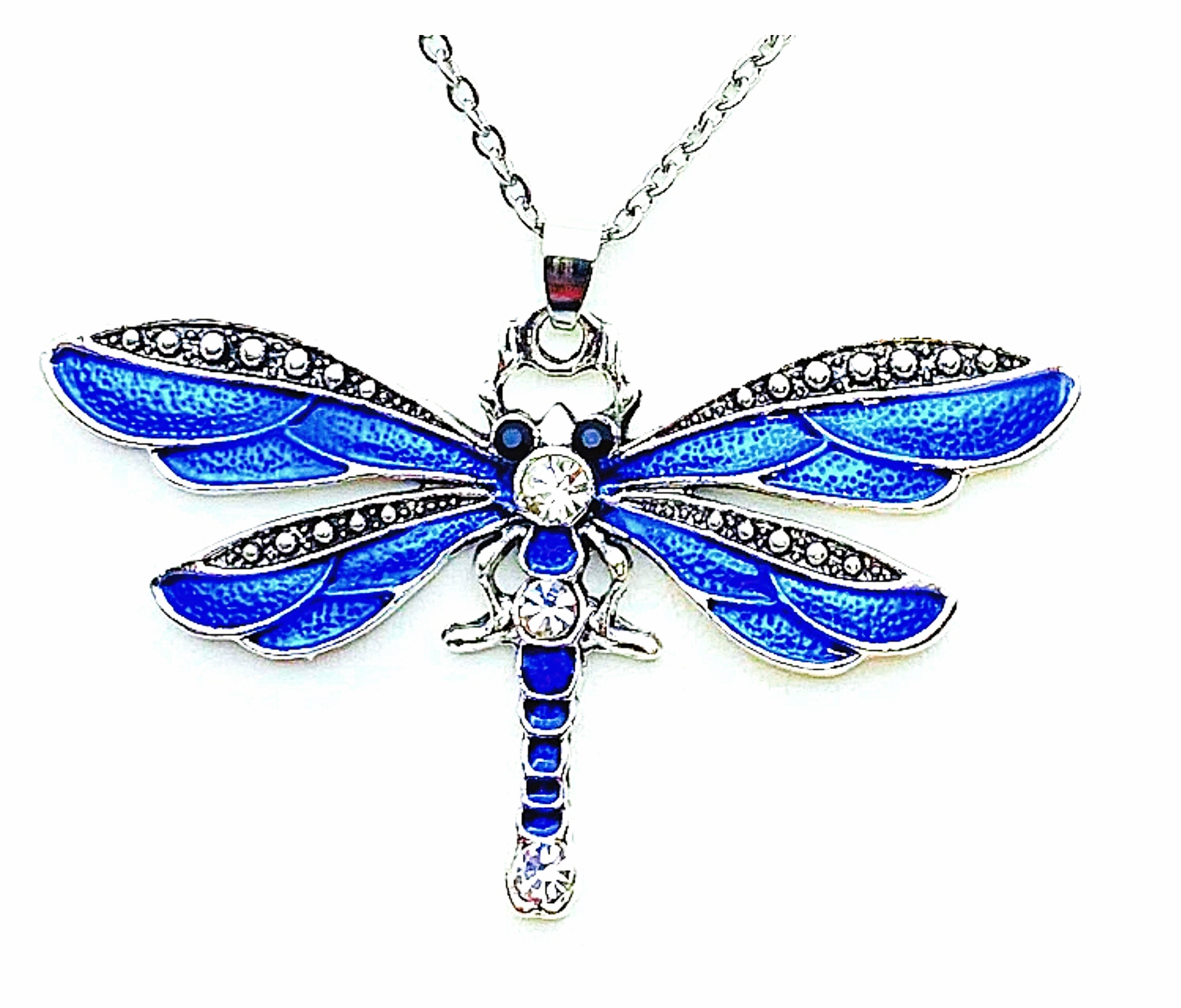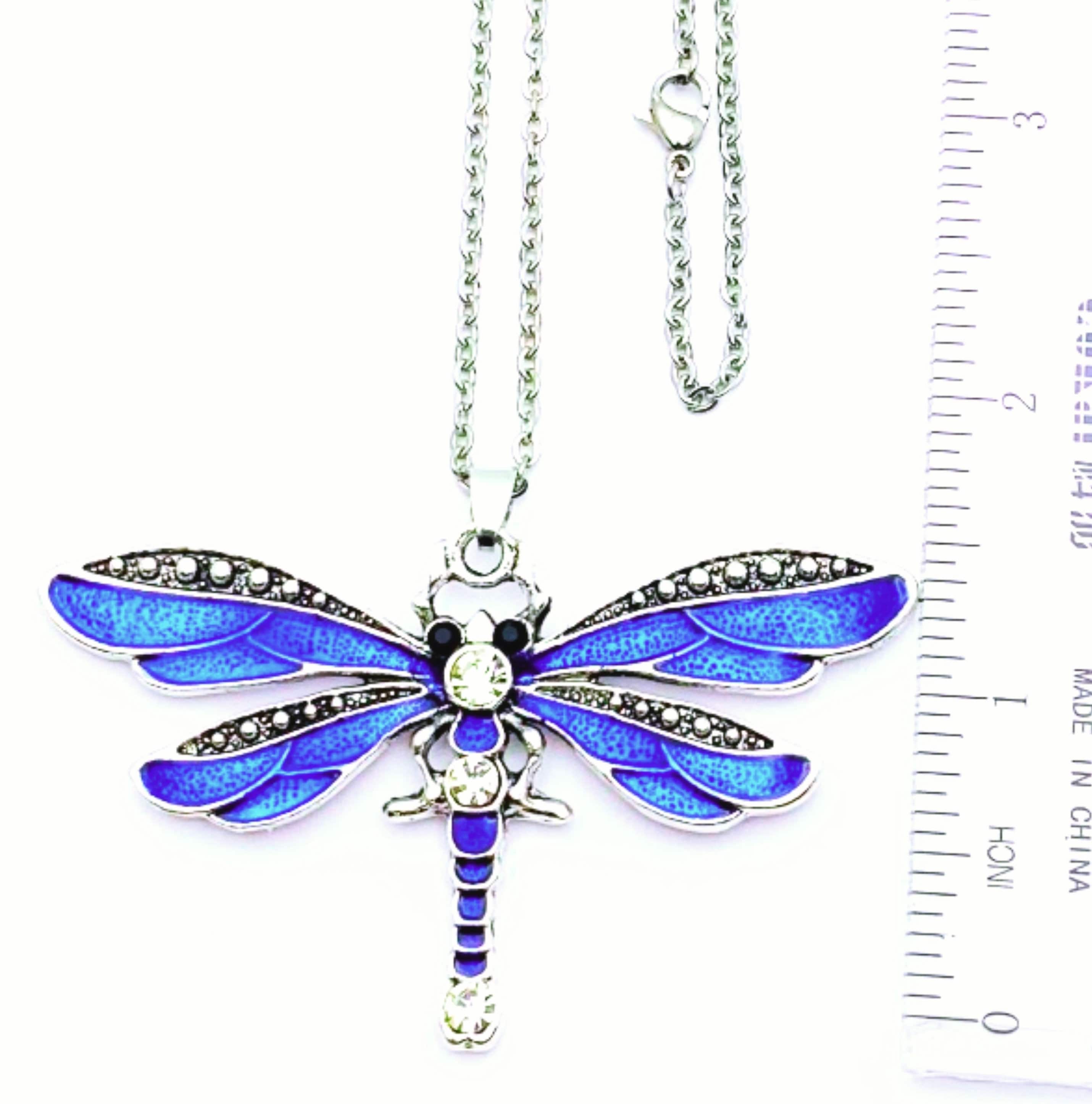 Dragonfly Silver and Blue Pendant Necklace (Pendant 2.83 inch wide and 1.65 inch long). Antique silver plated alloy with enamel and rhinestones dragonfly on a 24" tarnish resistant stainless steel chain. Pendant is 72 mm wide and 42 mm long. (2.83 inch wide and 1.65 inch long) 1652832BlDF